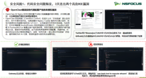OpenClaw由个人程序员编写,从发布到爆火仅仅几个月时间,由于自身设计特点,存在天然的“信任边界模糊”问题。它具备持续运行、自主决策、调用系统和外部资源等能力,在缺乏有效权限控制、审计机制和安全加固的情况下,将面临三重严重风险:安全风险1:代码安全堪忧——三天两高危RCE,系统可被恶意接管OpenClaw的代码库在短期内连续曝出两个高危远程代码执行漏洞(RCE)。攻击者无需复杂操作,即可利用漏洞在目标主机上执行任意代码,实现从“入侵”到“接管”的一步跨越。一旦得手,OpenClaw所在的主机将成为攻击者的“肉鸡”,企业核心数据、内部网络将完全暴露在风险之下。这不是危言耸听,而是已在野外被积极利用的真实威胁。