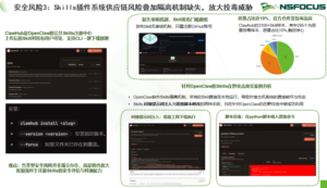 安全风险3: 插件系统成供应链突破口——隔离机制缺失,投毒威胁放大OpenClaw支持通过Skills插件系统扩展功能,但这片“沃土”也成为攻击者的乐园。第三方插件来源不明、供应链环节缺乏审查,加之OpenClaw自身对插件运行缺乏有效的隔离机制,使得一个被投毒的插件就能成为“特洛伊木马”。一旦插件被安装,恶意代码便能随OpenClaw权限肆意横行,窃取数据、植入后门,甚至通过插件更新机制将投毒扩散至更多用户。供应链安全的薄弱环节,在此被无限放大。