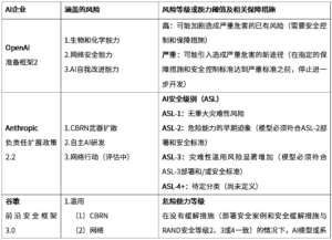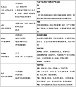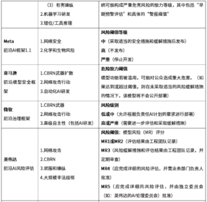 表3.5:签署了《前沿AI安全承诺》的部分AI开发企业发布的第一批前沿AI安全框架,涵盖的风险相似(但略有不同),采用不同的风险等级评定和风险管理方法。