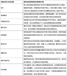 风险分析与评估旨在确定AI模型或系统的风险等级,将其与既定标准进行比较,评估其可接受程度或是否需要缓解。风险分析与评估实践案例包括通过基准测试和评估衡量模型性能、开展红队演练、影响评估以及审计(见表3.2)。