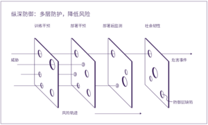 “纵深防御”模型可以支持通用AI风险管理。“纵深防御”指在开发和部署的不同阶段应用的技术、组织和社会措施的组合(见图3.5)。创建多层独立的安全保障措施,即使某一层失效,其他层仍然可以进行有效防御。纵深防御模型的常见示例之一是传染病预防措施。打疫苗、戴口罩、勤洗手等方法单独使用都不能达到100%的有效性,但把它们结合起来可以显著降低感染风险。对于通用AI而言,纵深防御模型包括的是针对更广泛的生态系统而非AI模型本身的控制措施,主要针对事故、故障和恶意利用相关的风险,在系统性风险管理方面可能发挥的作用较小。