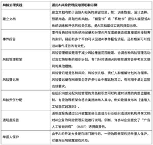早期的部分监管办法通过引入法律要求提高风险管理标准化和透明度。2024年生效的欧盟《AI法案》对通用AI模型的透明度、版权和安全性提出了要求。2025年发布的《通用人工智能实践准则》通过提供模型文档和版权方面的指导,以及针对最先进的模型提供的风险管理实践支持对义务的遵守。