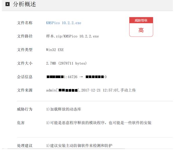 在绿盟威胁分析系统TAC沙箱中,运行该KMSpico软件,分析显示该软件威胁等级为“高”。该软件加载释放的动态库存在威胁,沙箱显示“可能是恶意程序释放的模块程序”。同时,TAC给出的处理建议“建议安装主动防御软件来检测和防护”。