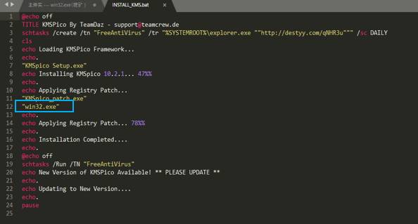 绿盟威胁情报与网络安全实验室专家对感染病毒的KMSpico软件做了进一步分析。KMSpico软件中有若干批处理工具,其中有一个批处理工具样本是win32.exe,如下图所示: