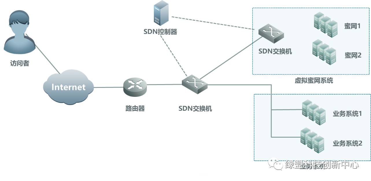 SDN蜜网,主要是指在SDN网络中,通过蜜罐/蜜网技术,实现业务系统的安全防护。众所周知,SDN网络可以理解为一种集中控制的网络,通过逻辑上集中的控制平面,一方面能够获取到全局的网络信息,另一方面,能够灵活的对特定流量进行调度。这样结合虚拟化技术,就能够在威胁发现之后,动态的生成相应的蜜网系统,同时利用SDN控制器,将异常流量调度到虚拟化的蜜网系统中,完成异常行为的跟踪取证与安全防护。如下图所示,就是基于SDN网络组建的虚拟化蜜网防护系统的一个简单的逻辑图。这种SDN蜜网的好处在于有效的解决了前文所提到的传统蜜网的部署结构不灵活,基础设施成本高等问题。