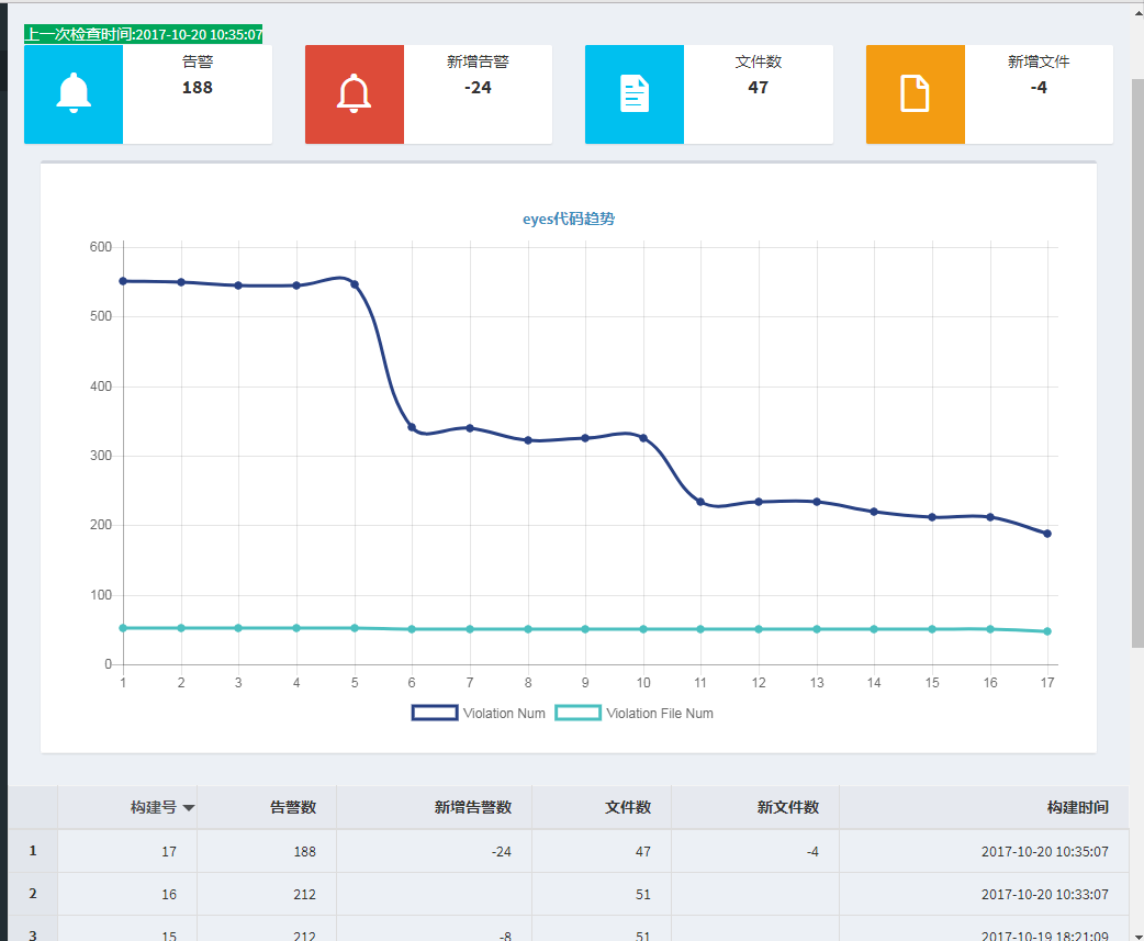 这里可以看到具体项目代码质量的一个趋势图以及趋势差异表格. 点击代码趋势可以跳转到jenkins上展示的详细信息。