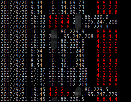 XShell后门通过DNS协议分别向8.8.8.8|8.8.4.4|4.2.2.1|4.2.2.2|[本地dns服务器]发送请求,等待回应。下面截图为针对这些服务器发起连接的部分截图