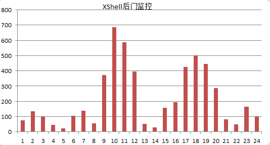 从上图中可以看出,xshell后门爆发和工作时间基本吻合,即在上下午的工作时间刚好是xshell后门爆发的高峰期,而在中午和夜间相对要少很多。